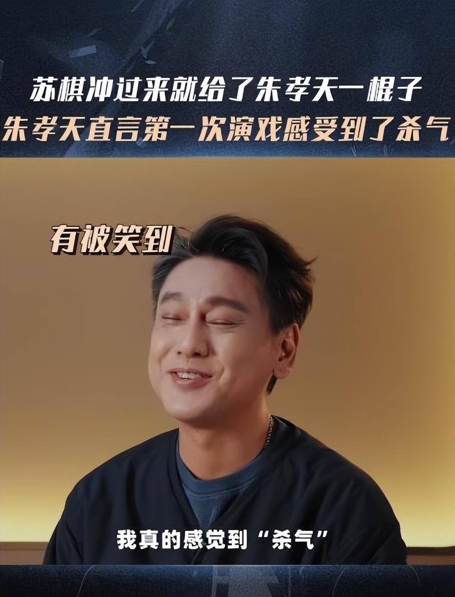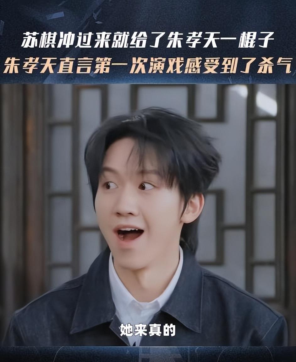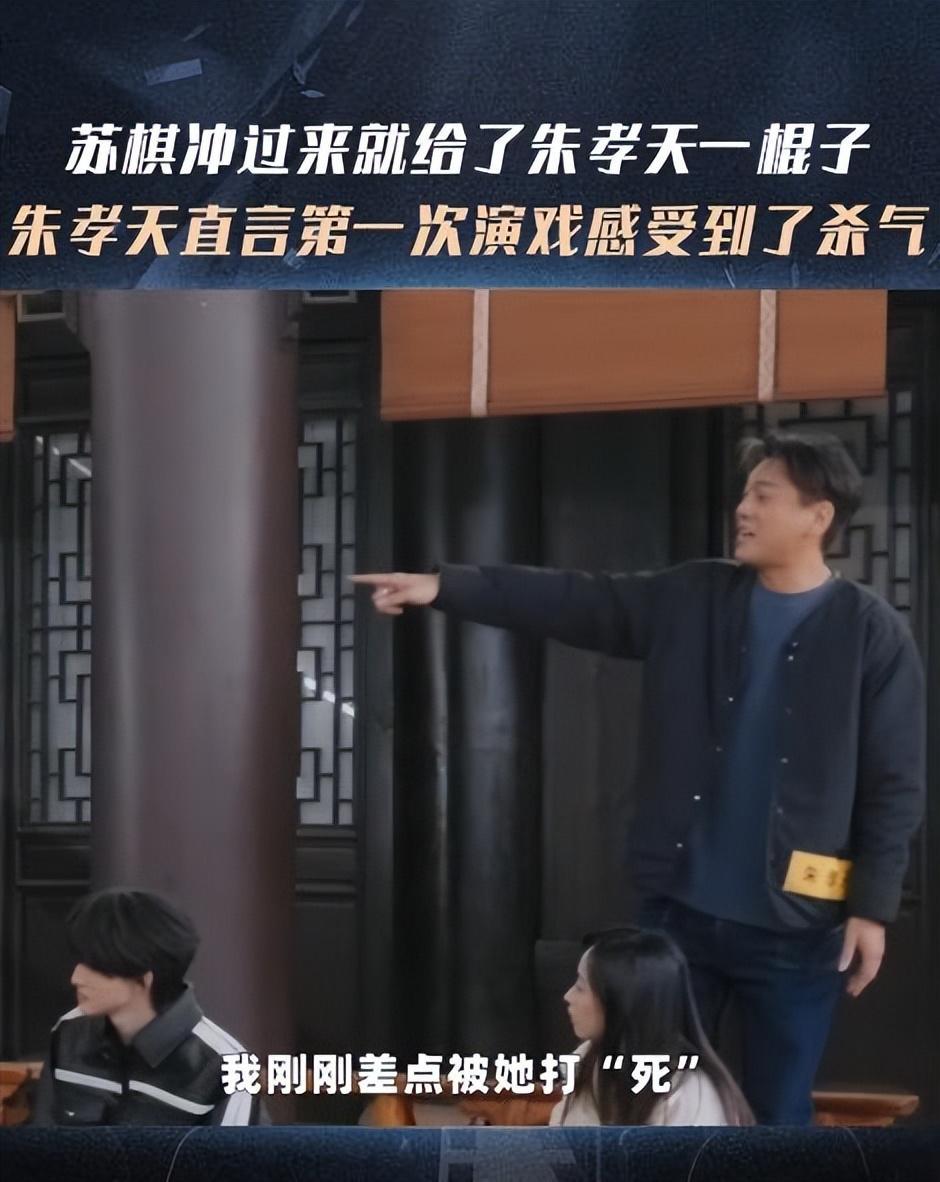 当时的情景是即兴考核,朱孝天和苏棋饰演争夺唯一逃生机会的公司职员。戏到激烈处,苏棋为阻止朱孝天离开,抄起道具木棒就朝他头部挥了过去。这一下,显然超出了 " 表演 " 的范畴——毫无防备的朱孝天瞬间抱头,表情痛苦,错愕得连台词都忘了接,脱口而出一句:" 她来真的?!"
